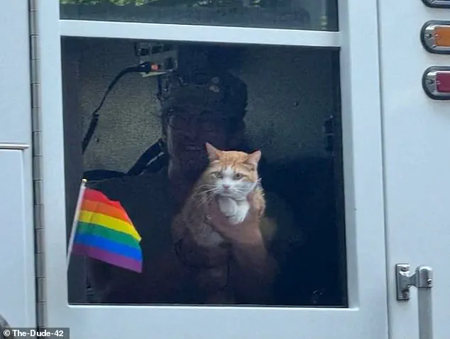 The orange tabby, who boasts over 28,000 TikTok followers, was lifted out of the window of a fire truck adorned with rainbow Pride flags, drawing cheers from the crowd and sparking a firestorm of debate within the local fire department.