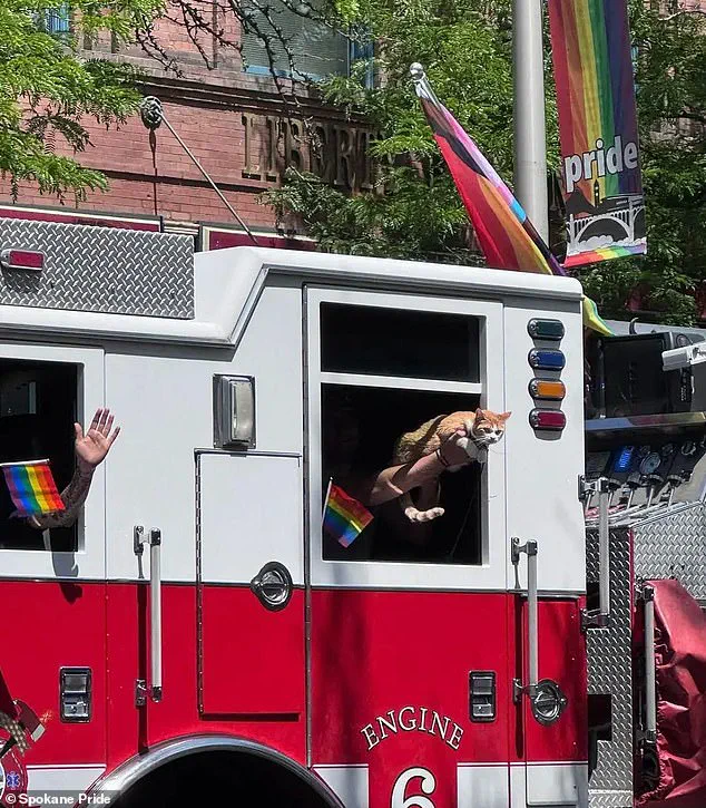 Selkirk, an adventurous orange cat with over 28,000 TikTok followers, along with his owner, made a surprise appearance out the window of a Pride-adorned firetruck during the Spokane Pride Parade and Festival in Washington earlier this month (pictured)