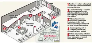Footage released by authorities shows the moment champagne sparklers ignited material on the bar’s ceiling, triggering a flashover—a rapid, intense fire that left little time for occupants to escape.