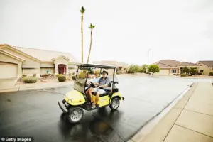 A file photo captures a couple leisurely driving a golf cart down a street in a retirement community, a scene that might seem idyllic but is steeped in legal nuance.