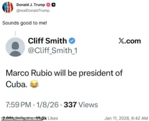 On Sunday morning, Trump took to Truth Social to respond to a random X user’s post stating, ‘Marco Rubio will be president of Cuba,’ with a cryptic ‘Sounds good to me!’ The comment, though brief, has ignited a firestorm of memes, political analysis, and questions about the administration’s priorities.