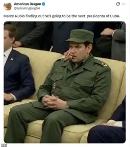 The internet has quickly seized on the notion, flooding social media with images of Rubio in what can only be described as a ‘Cuban president’ costume.