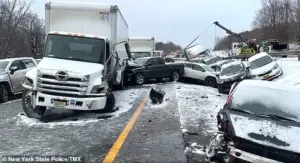 Meanwhile, in New York, a separate 30-vehicle pileup on Interstate 81 left seven people hospitalized, their injuries a stark reminder of the storm’s reach.