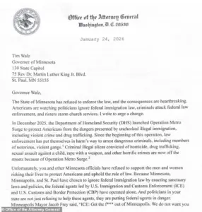 In a three-page letter, Bondi accused state officials of engaging in ‘anti-law enforcement rhetoric’ and ‘putting federal agents in danger.’ She called for the repeal of sanctuary policies in Minnesota and demanded that all detention facilities in the state ‘cooperate fully with ICE’ and ‘honor detention retainers.’ Additionally, Bondi requested that Minnesota provide the Department of Justice (DOJ) access to its voter rolls to ensure compliance with federal law. ‘I am confident that these simple steps will help bring back law and order to Minnesota and improve the lives of Americans,’ Bondi asserted, framing the letter as a necessary measure to restore stability to the state.