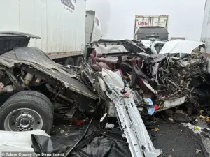 Drivers, blinded by the whiteout conditions, had no chance to react before the first vehicle skidded off the road, triggering a chain reaction that would leave dozens of cars and trucks mangled in its wake.