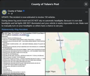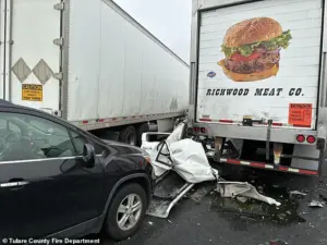 Officials emphasized that fog was the primary factor behind the pileup and issued urgent warnings to motorists about a common and dangerous mistake. ‘During dense fog avoid travel and DO NOT rely on automatic headlights,’ county officials warned, underscoring the critical need for caution in the Central Valley’s unpredictable weather conditions.