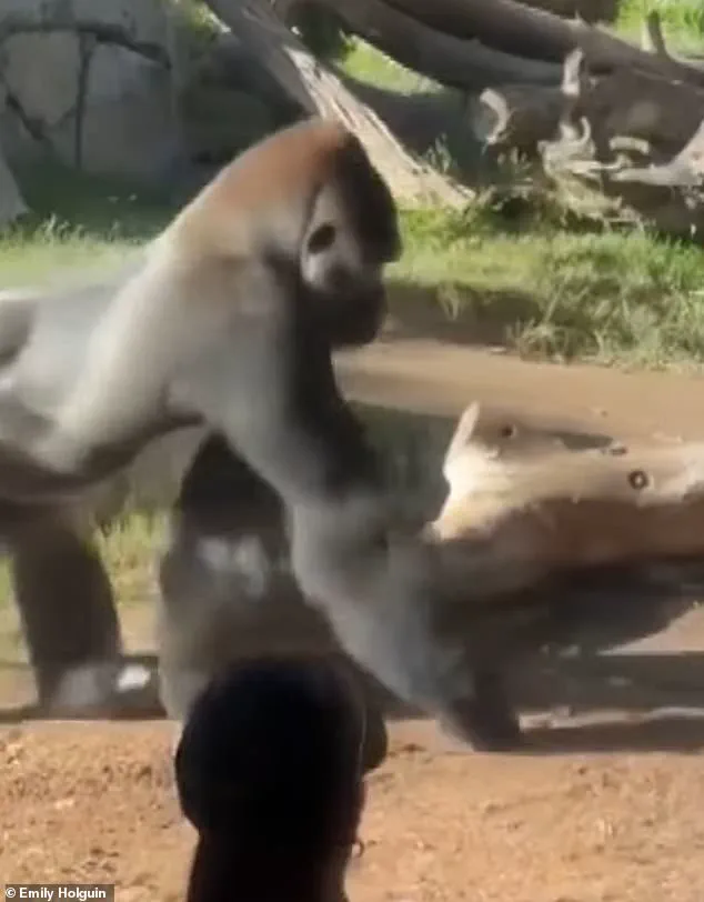 Erin Riley, a primate behavior specialist and anthropology professor at San Diego State University, told CBS8 that 'charging displays' are a normal part of gorilla behavior. 'Gorillas, particularly males, will often do what we call "charging displays," as a kind of act of showing off,' Riley explained. 'One of the things gorillas actually don't like is to be stared at directly in the eyes, and that's not something that zoo visitors always understand.' While some zoogoers rushed away, others moved in closer to see the damage for themselves.